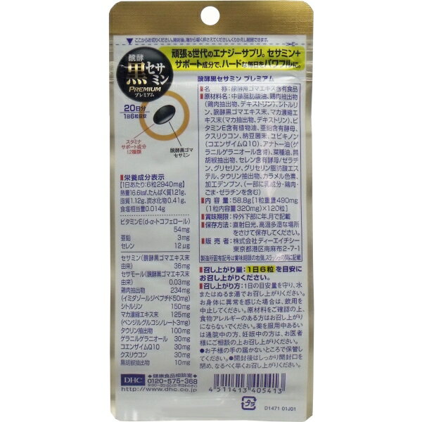 DHC ニュースリム ダイエット 20日分 80粒DHC ガルシニアエキス 20日分 100粒DHC ギムネマ 20日分 60粒DHC 肝臓エキス+オルニチン 20日分 60粒入DHC 主食ブロッカー 20日分 60粒入DHC アスタキサンチン 20日分 20粒入DHC はとむぎエキス 20日分 20粒入DHC ローヤルゼリー 20日分 60粒入DHC トンカットアリエキス 20日分 20粒入DHC セントジョーンズワート 20日分 80粒入DHC EPA 20日分 60粒入DHC マルチビタミン/ミネラル+Q10 20日分 100粒入【DHC 発酵黒セサミンプレミアム 20日分 120粒入】広告文責(有)イースクエアTEL:0120-532-772株式会社DHC個装サイズ:89X186X8mm個装重量:約70g内容量:58.8g(1粒重量490mgX120粒)【発売元:DHC】【原材料】鶏肉抽出物(鶏肉抽出物、デキストリン)、シトルリン、醗酵黒ゴマエキス末、マカ濃縮エキス末(マカ抽出物、デキストリン)、ビタミンE含有植物油、亜鉛含有酵母、クスリウコン、納豆菌末、ユビキノン(コエンザイムQ10)、アナトー油(ゲラニルゲラニオール含有)、黒胡椒抽出物、セレン含有酵母、タウリン抽出物、中鎖脂肪酸油、菜種油、グリセリン脂肪酸エステル、加工デンプン、ゼラチン、グリセリン、カラメル色素、(原材料の一部に乳を含む)【栄養成分】(1日6粒(2940mg)あたり)熱量・・・16.6kcaLたんぱく質・・・1.21g脂質・・・1.12g炭水化物・・・0.41g食塩相当量・・・0.014gビタミンE(d-α-トコフェロール)・・・54mg亜鉛・・・3mgセレン・・・12μgセサミン(醗酵黒ゴマエキス末由来)・・・36mgセサモール(醗酵黒ゴマエキス末由来)・・・0.03mg鶏肉抽出物・・・234mg(イミダゾールジペプチド50mg)シトルリン・・・150mgマカ濃縮エキス末・・・125mg(ベンジルグルコシノレート3mg)タウリン抽出物・・・100mgゲラニルゲラニオール・・・30mgコエンザイムQ10・・・30mgクスリウコン・・・30mg黒胡椒抽出物・・・10mg【召し上がり方】1日6粒を目安に水またはぬるま湯でお召し上がりください。