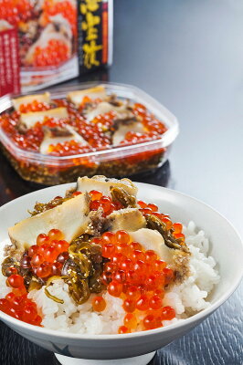 めかぶ醤油漬に、「だまし煮」という技法で柔らかく煮上げたあわびと、濃厚いくらをトッピングした中村家のベストセラー商品。